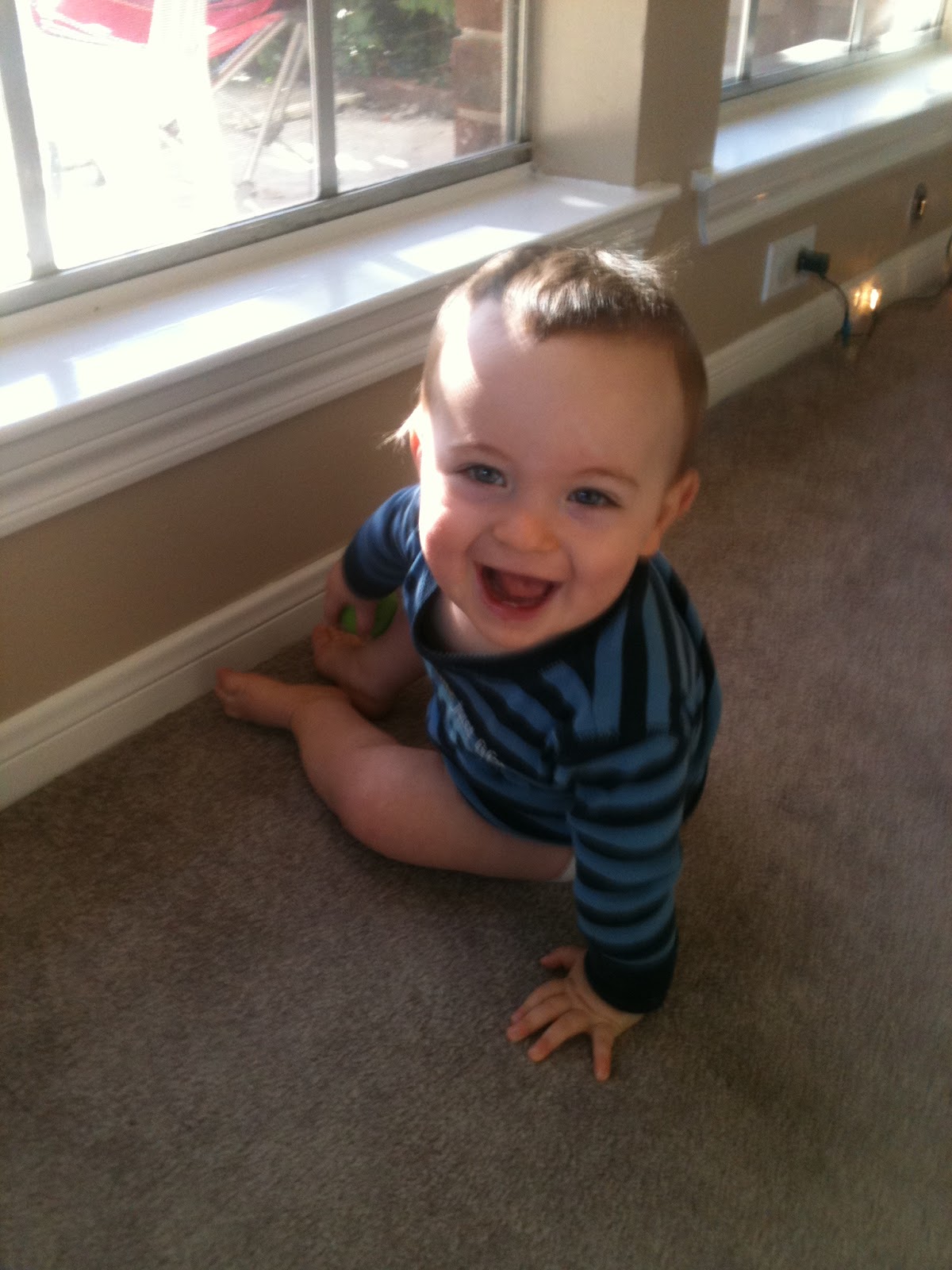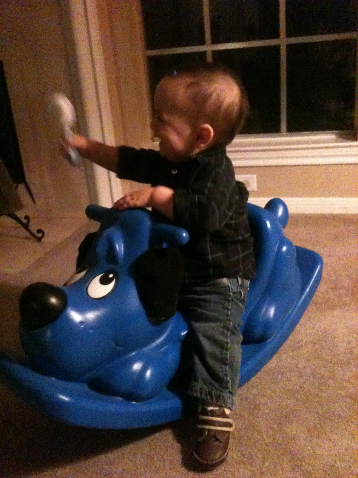 And then I found Big Blue, a rocking horse-type toy that my neighbor’s little girl almost didn’t let her dad sell to me when she saw him loading it into my trunk. Big Blue is a big blue plastic puppy with soft velvet ears and a place to sit on his back. I was able to placate Big Blue’s former owner by promising her that Gabriel and I would take very good care of him.