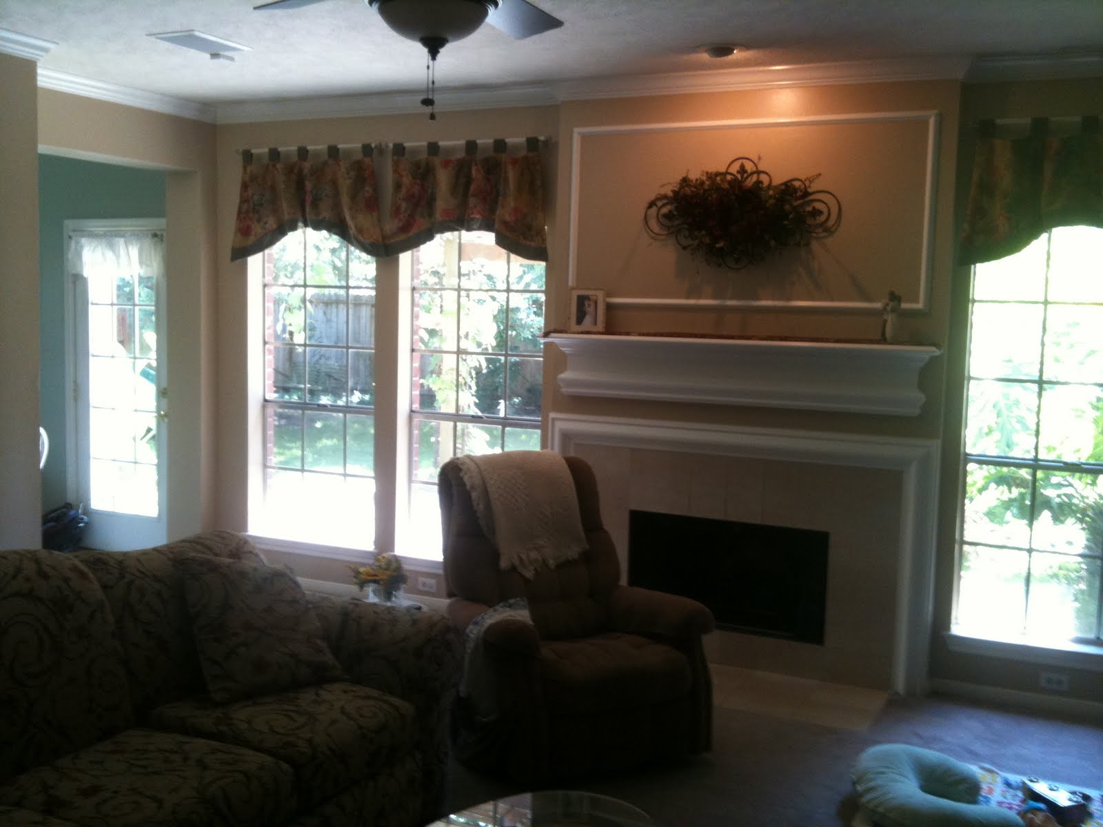 I know the picture is dark, but this is the swag hung up on the mantle. It matches the curtains the previous owners left, which is nice! I had wanted to buy/make new curtains for my living room, but when the realized how much fabric costs, I knew I’d have to stick with these for a while!