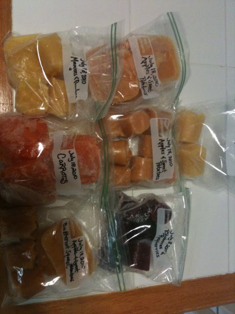 Here is the result of all my efforts, minus quite a few cubes that Gabriel already inhaled. He LOVES to eat baby food and has quite an appetite so far! It does seem like a little less quantity-wise than I thought it would be, but I only got a couple of pieces of each fruit and/or vegetable, since this was my first try.