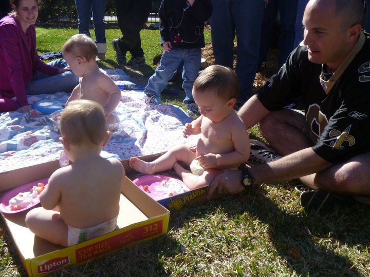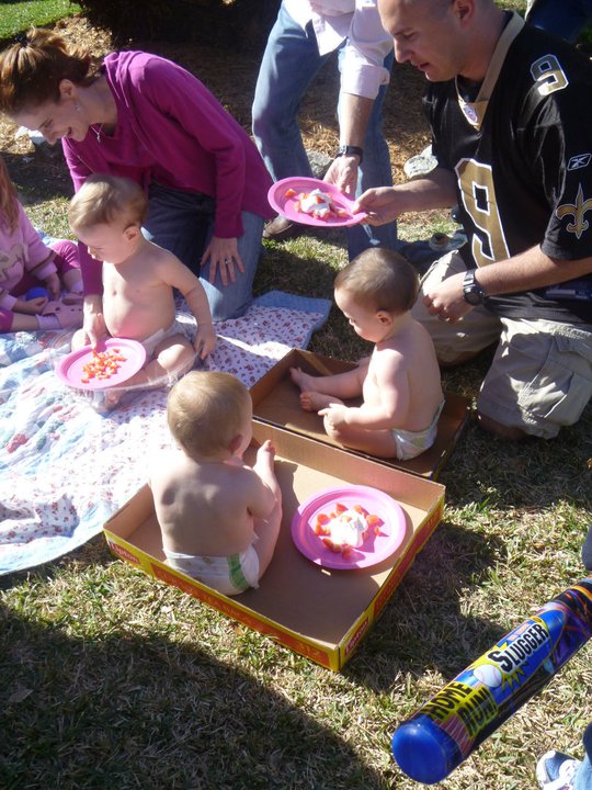 Peter Fontana came up and told Michael and I when we arrived that his family had a special tradition that on each child’s first birthday: the birthday boy or girl was put into a box filled with whipped cream and strawberries with whatever friends of theirs were a year old as well. That meant that Gabriel and the child of some other friends of ours, Blaise, got to strip down to their diapers and eat as much whipped cream and strawberries as they wanted! On camera, of course! See below 🙂