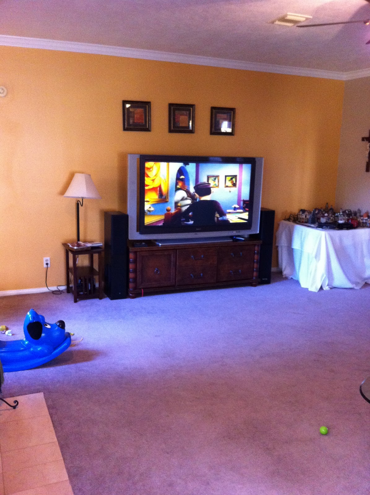 To make a long story short, some incredibly generous friends of ours gave us this 5-year-old TV when the bulb on this one went out. Michael spent a little money buying and installing a new bulb, and–Voila!–we’ve entered the ranks of the world’s Very Large TV Owners. I’ve had mixed feelings about owning a Very Large TV, but more on that in another post. π Michael and I both really enjoy watching movies and having people over, and our new TV will make it more fun to have people over for movie nights and football games, for example. We are actually having a bunch of people over in a few weeks for the Cotton Bowl (Texas A&M vs. LSU!), and it will be a blast to have this big TV then. π