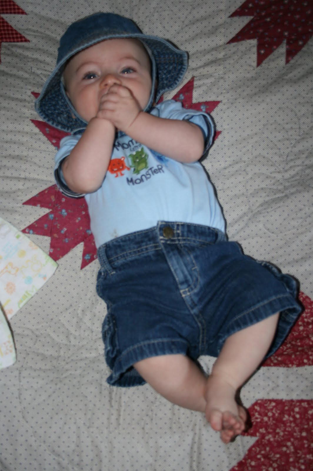 I betcha that 20-something years from now, Gabriel is going to look back on his old baby pictures and moan about how dorky all of his baby clothes were. Aside from the girly hat, he will probably take issue with the jean shorts/capris I have him in right now (otherwise known as “jorts” or “japris”). At which point I will agree with him that jorts and japris for men should not be socially acceptable in any period of history. Except on babies. 🙂