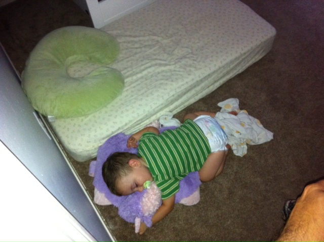 We took this little gem of a picture this afternoon. We decided this morning to convert Gabriel’s crib to a toddler bed today, but we hadn’t finished the project before naptime. I was a little worried that he wouldn’t nap very well today sleeping on his mattress on the floor, but he went down quite happily surrounded by his purple unicorn Pillow Pal (thanks Aunt Rivers:) and his green Boppy (I’ll have to wean him off the Boppy once I need it again for his sister:).