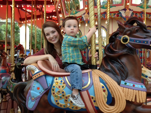 My mom, my sister Rivers and I took Gabriel on his first carousel ride at the mall on the day before New Year’s Eve. He was wide-eyed and skeptical when we first got on, but then he begged us to let him ride the carousel again afterwards! So we did. 🙂