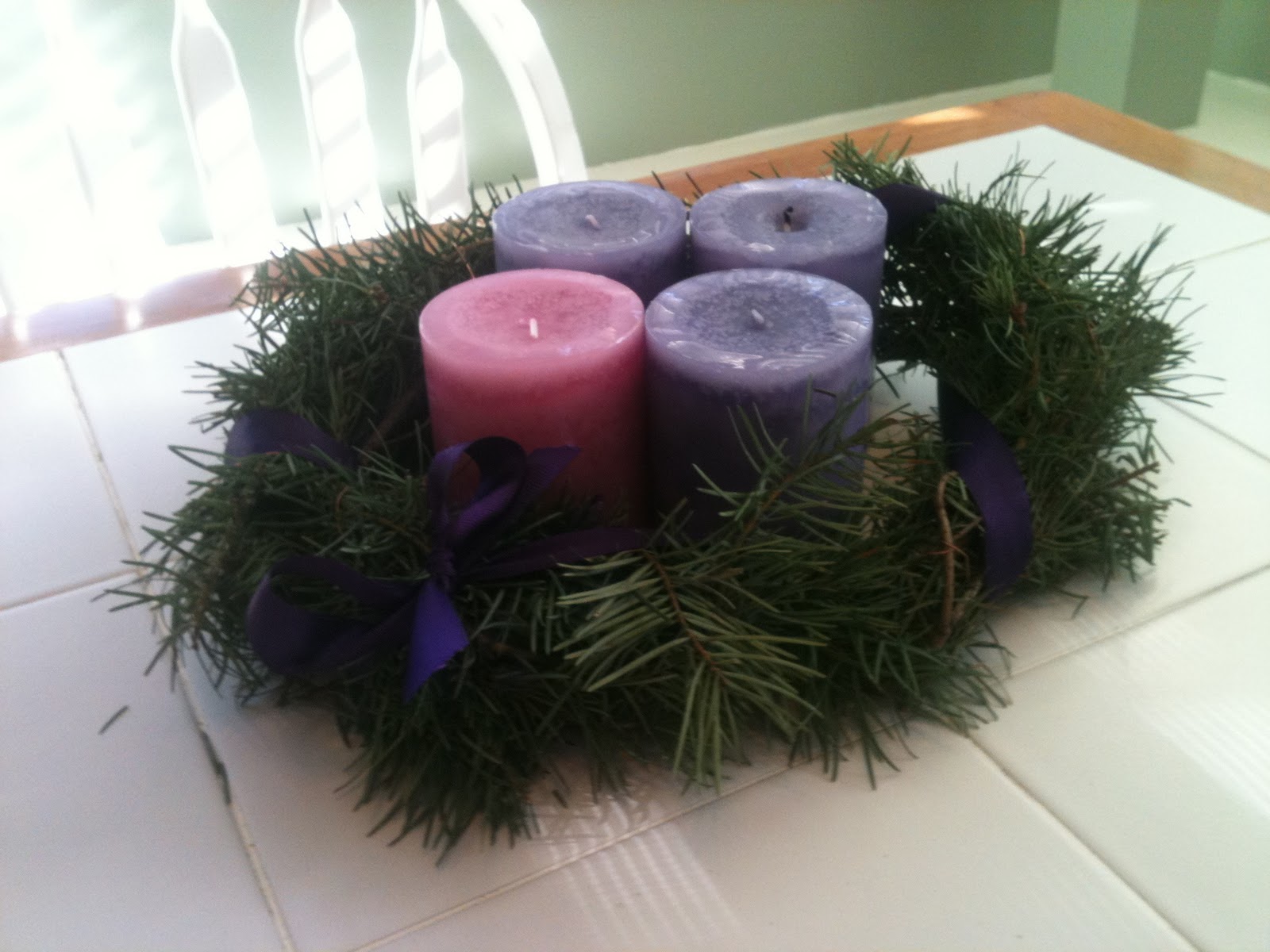 All I did was trim some wayward branches from our Christmas tree, cut off excess stems and fashion in a circle with some copper wire. Then, I tied a purple ribbon around it (mostly because that’s what Lucy did, and it looked lovely) and put my four candles in the middle.