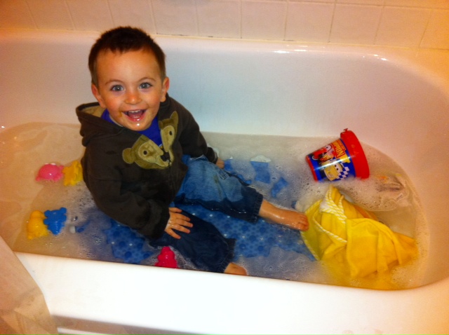 He sure loves baths. The thing is…I was running a bath for Faith. I turned around for probably 20 seconds to take off Faith’s diaper and onesie and grab her baby tub….sigh. Notice that the yellow bath towel was added to the fun. Claaaasic.