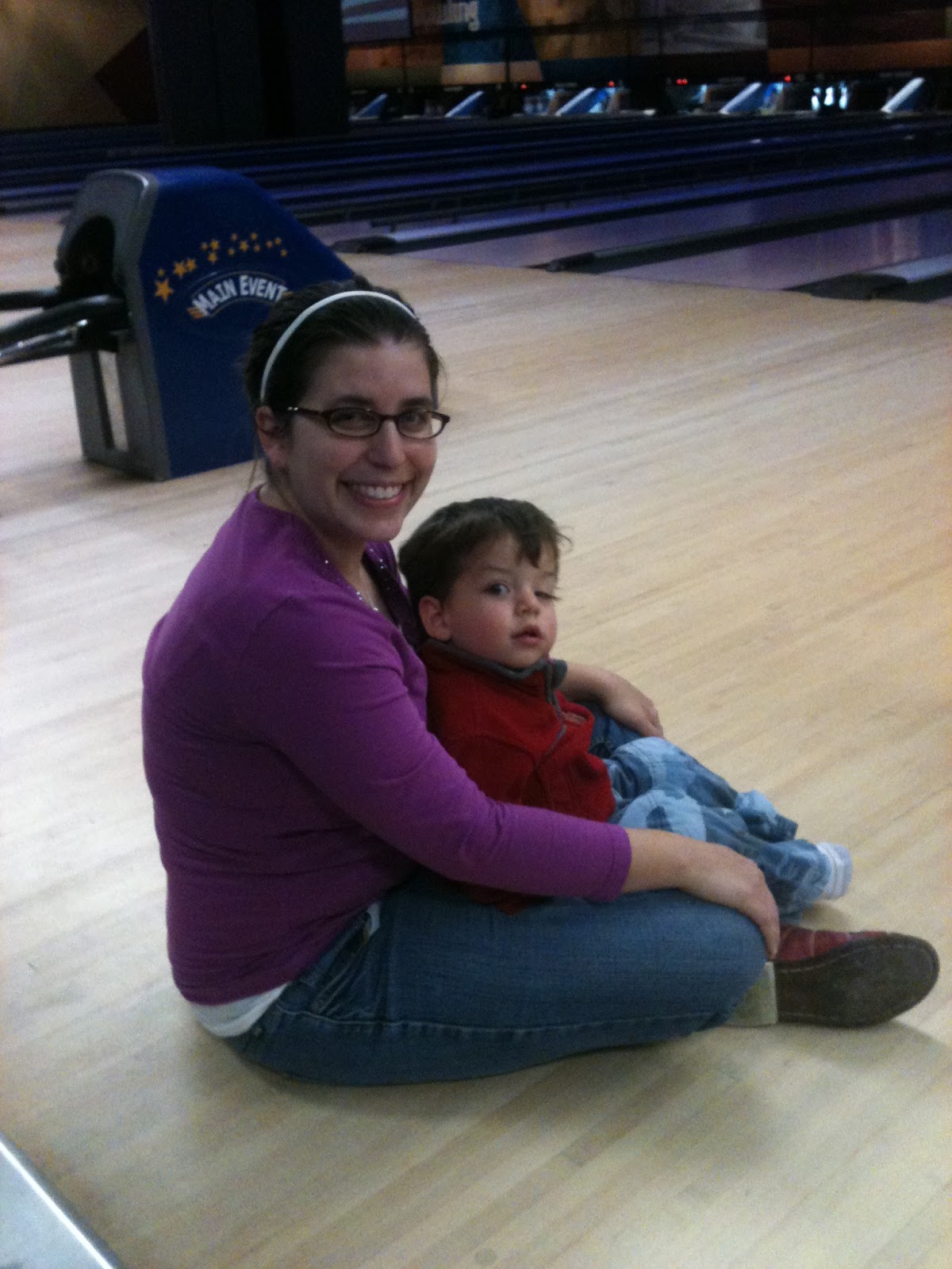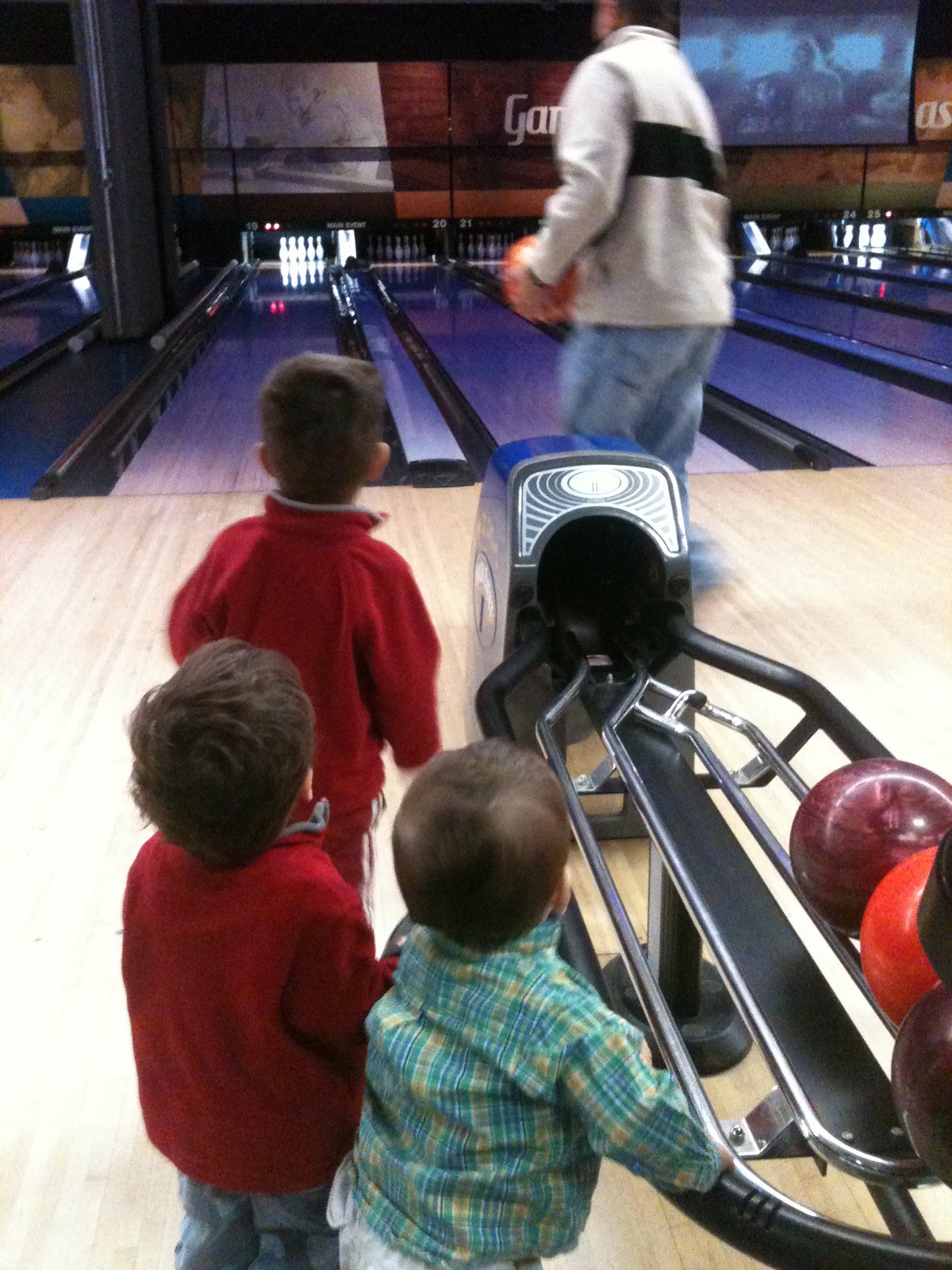 10:30 a.m. – We arrive at the bowling alley (which is actually really nice inside!) with six little boys under 3 and five adults. We have a blast. Michael teaches the older boys how to bowl, and tries to teach me too but is unsuccessful. I ended up in last place, 25 points from the person above me. I blame it on the baby π